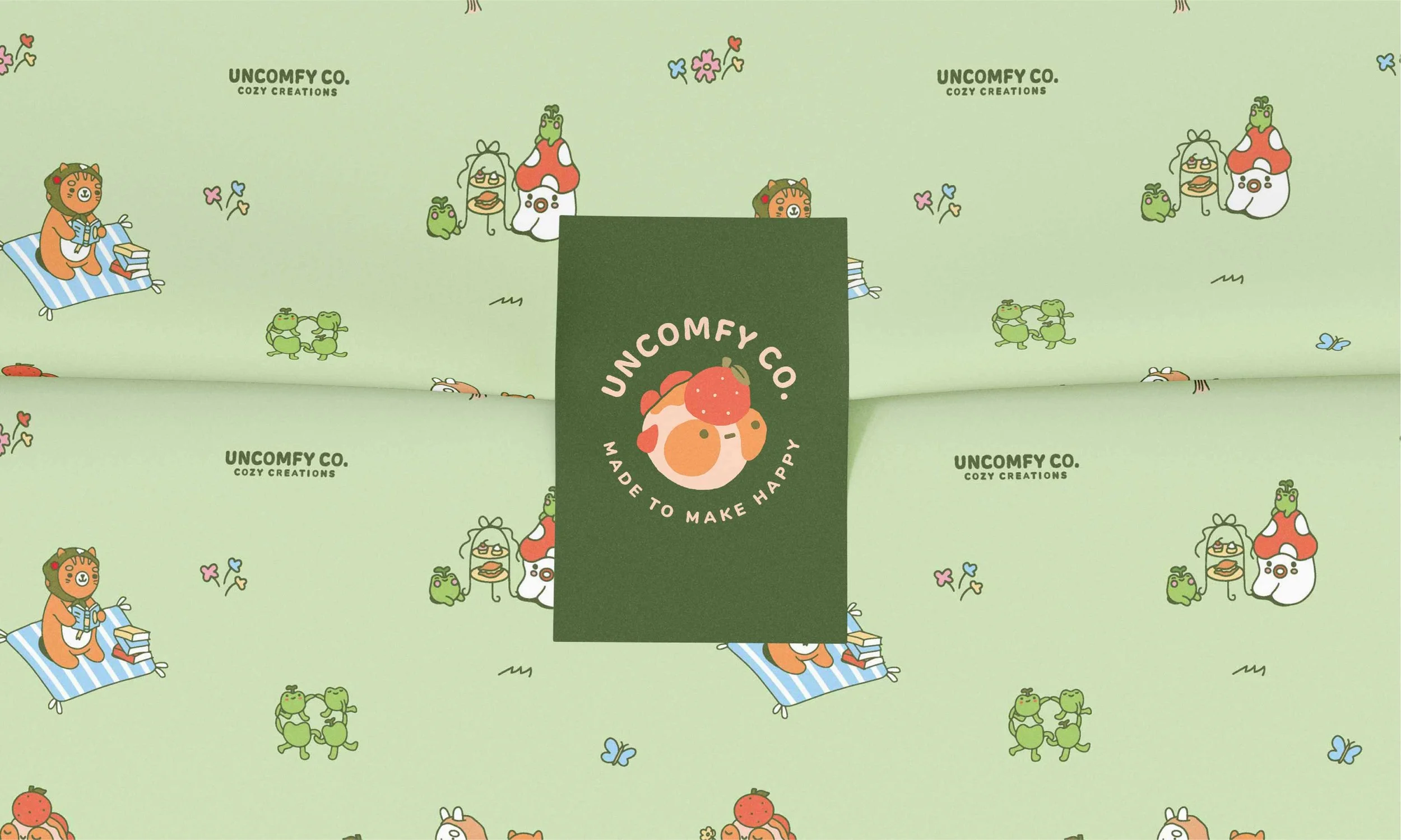 We designed the pattern as a playful yet cozy extension of the brand—featuring illustrations of some of Tammy’s signature clay characters gathered in a whimsical woodland picnic. Originally created for tissue paper, it adds delight to the unboxing experience.