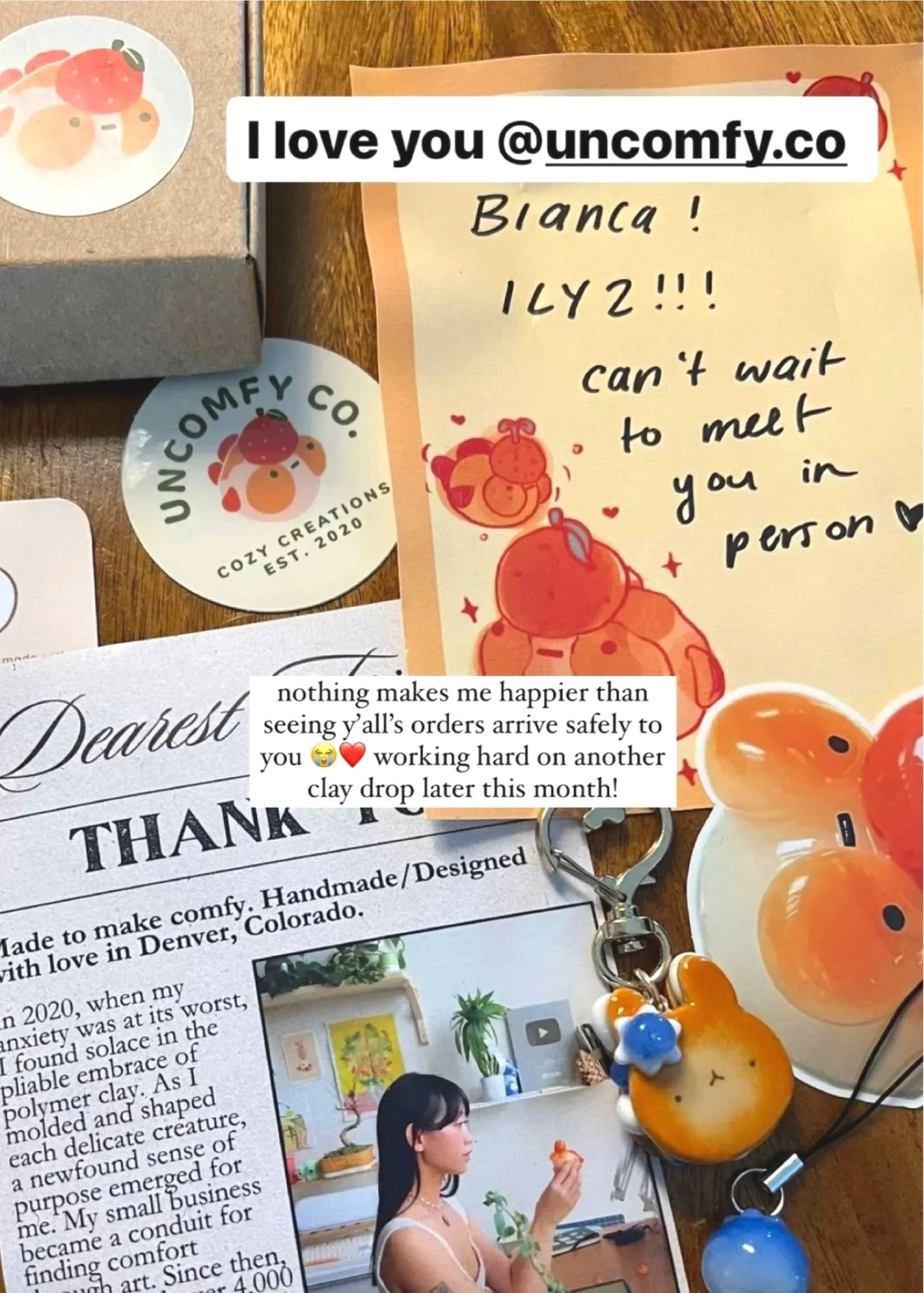 Tammy Dinh, the artist behind Uncomfy Co., creates charming polymer clay characters that offer comfort to those navigating worry and unease. Her lovable designs come to life as desk companions, keychains, pins, and more—spreading warmth and reassurance. Tammy approached me to develop a cohesive logo system and custom tissue paper packaging that reflected her brand’s identity. With over 800K followers across YouTube and Instagram, Uncomfy Co. brings comfort to a global audience, and I’m grateful to have contributed to its visual identity.